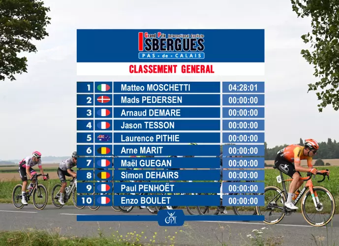 L’Italien Mattéo Moschetti remporte le 77ème Grand Prix d‘Isbergues, qui s’est terminé par un sprint massif. Le coureur de l’équipe Q36.5 Pro Cycling s’impose ainsi à la photo-finish devant les deux principaux favoris, le Danois Mads Pedersen (Lidl Trek) et le Picard Arnaud Démare (Arkéa Samsic). Beau tir groupé aussi des sprinters français qui placent 5 coureurs dans le top 10.